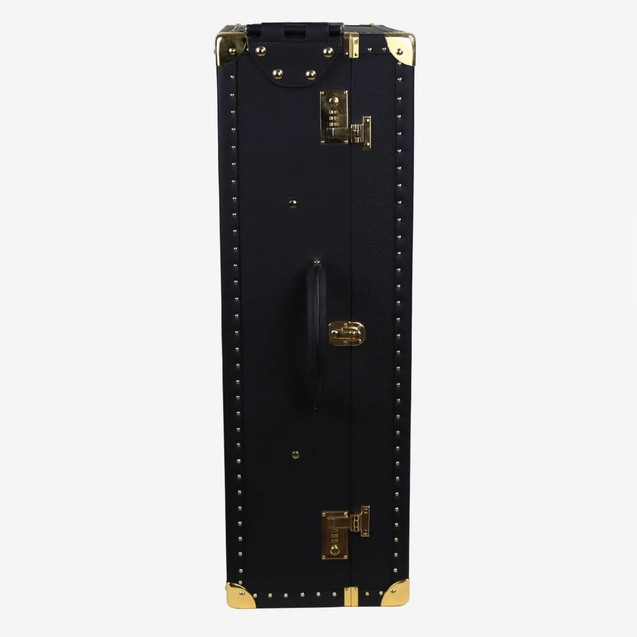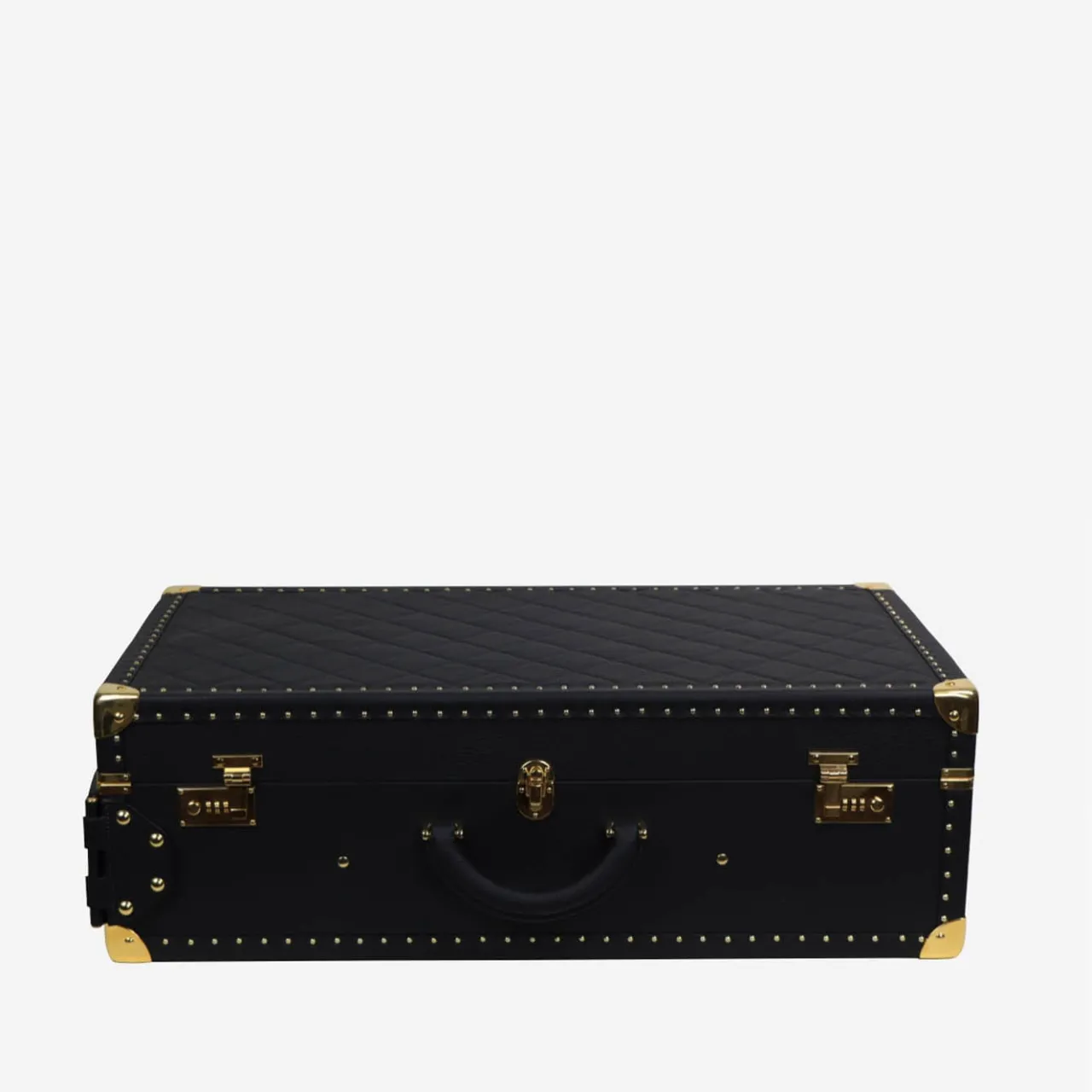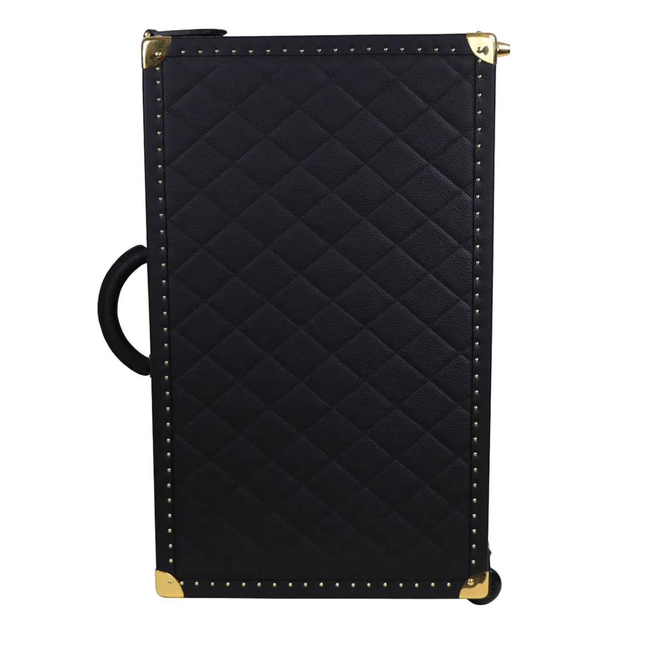 Un design classico reinterpretato in chiave sartoriale senza tempo, questa piccola valigia artigianale – disponibile anche in altre due misure – è il regalo perfetto per chi viaggia spesso e non rinuncia alla classe. Un rivestimento trapuntato in vera pelle nera avvolge la sua silhouette, impreziosita da minuteria dorata e sapientemente dotata di maniglie e di una pratica ruota. Le cinghie mantengono gli abiti al loro posto nel raffinato scomparto interno foderato.