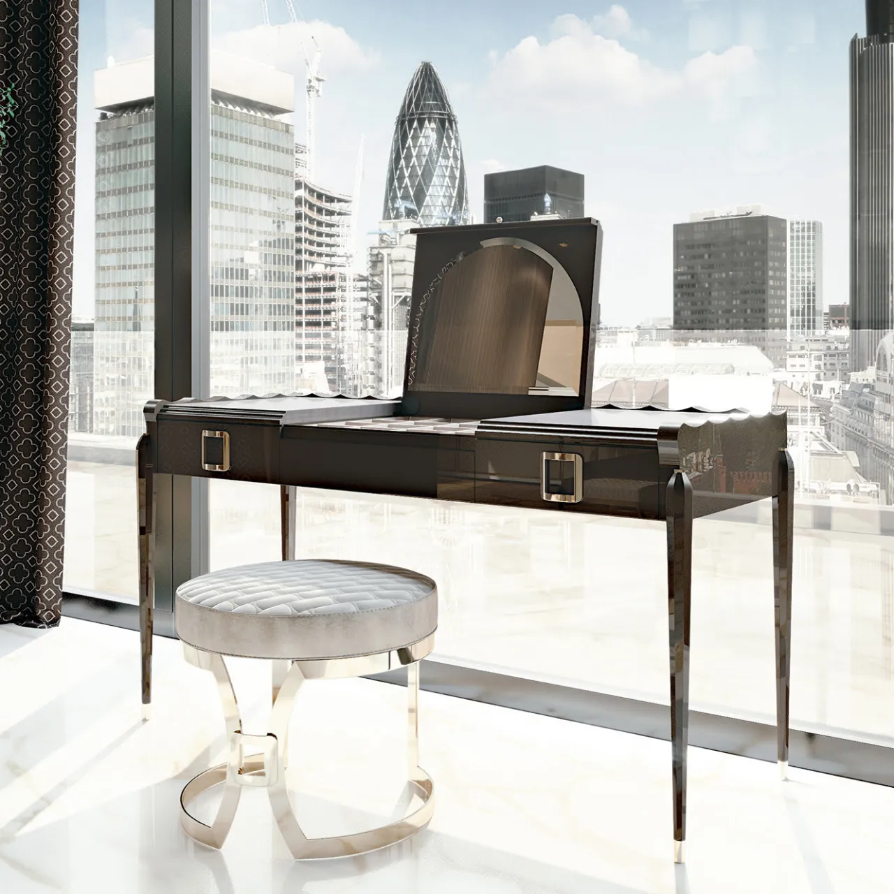 Il vanity Glamour è dotato di due cassetti e di uno specchio apribile. Caratterizzato da maniglie squadrate in metallo dorato, l’interno contiene un bellissimo portagioie imbottito.