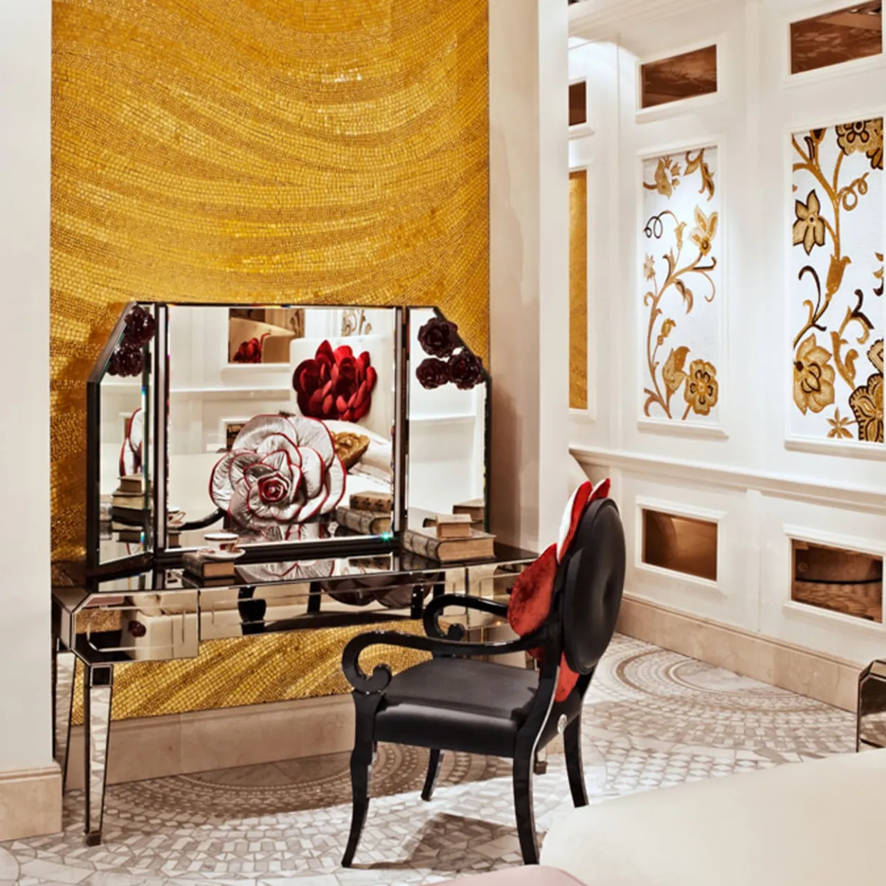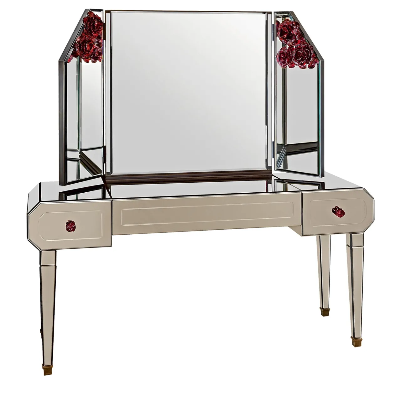 Forme forti e geometriche, ma ammorbidite dai rivestimenti a specchio in tonalità ambra e dai fiori decorativi in vetro rosso. Un vanity che sa farsi ammirare.