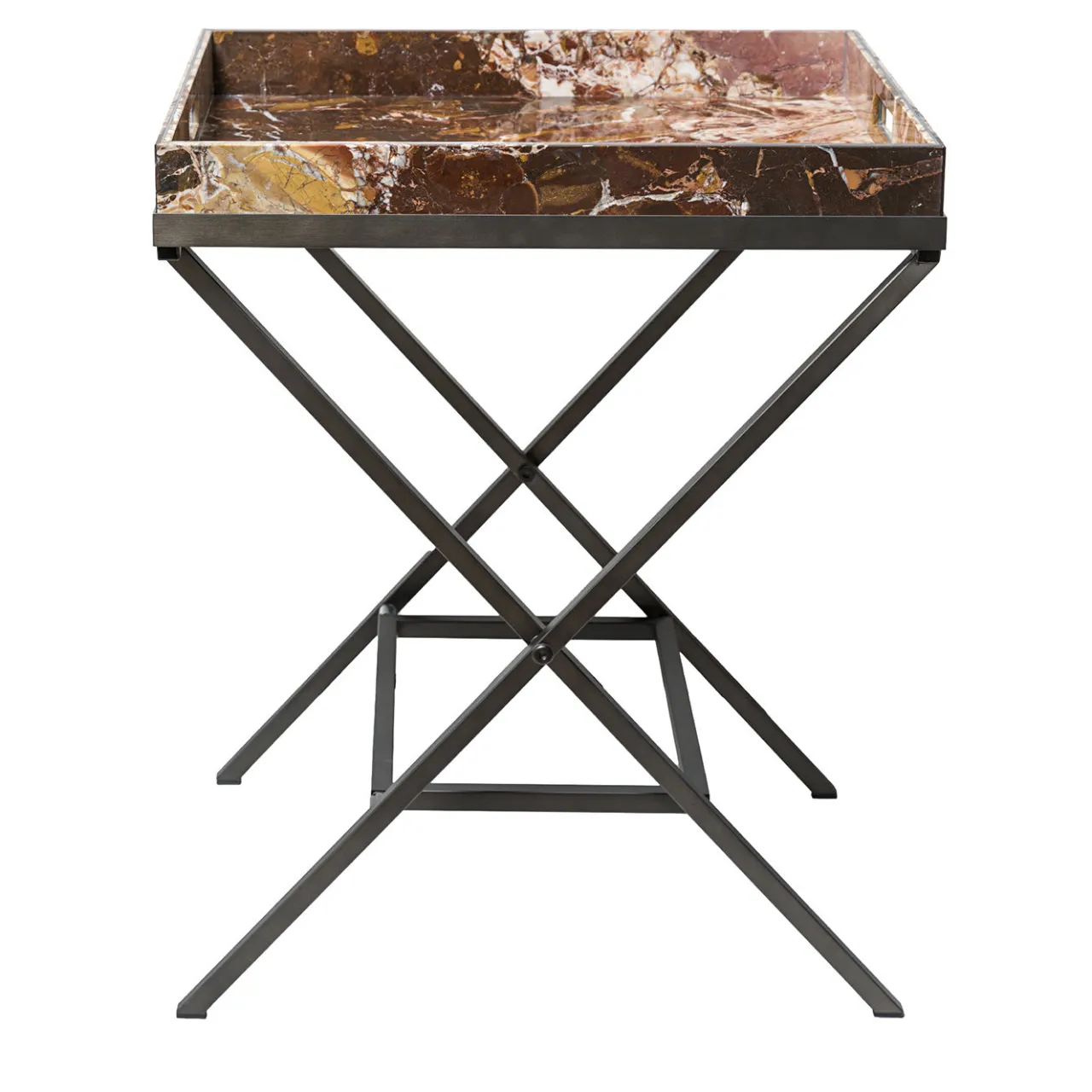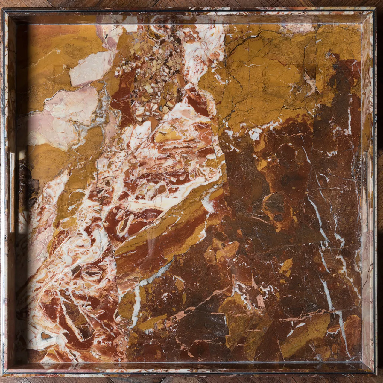 Questo tavolino incredibilmente versatile ed elegante è realizzato in raffinato marmo diaspro siciliano, con splendide tonalità di rosso e arancio che mettono in risalto le naturali venature bianche della pietra. Poggiato su una base in metallo satinato con finitura in bronzo e due gambe a forma di X con un allungamento rettangolare, il piano può essere rimosso e utilizzato come vassoio funzionale, grazie alle sue uniche maniglie intagliate. Si tratta di un accessorio davvero sofisticato che valorizzerà qualsiasi sala da pranzo contemporanea o tradizionale.