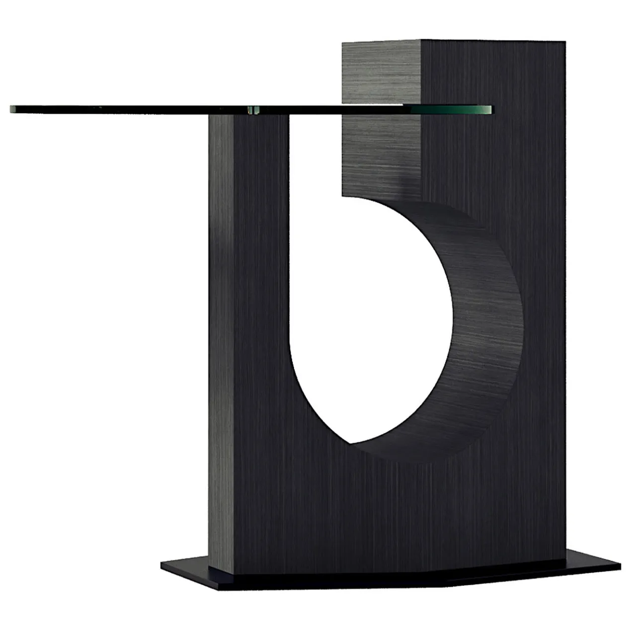 Tavolino in Tay scuro con piano in vetro trasparente, disponibile anche in vetro verniciato. Struttura disponibile nelle finiture Tay chiaro e laccato. Base in metallo con finitura bronzo-oro, disponibile anche in piombo e brunito.