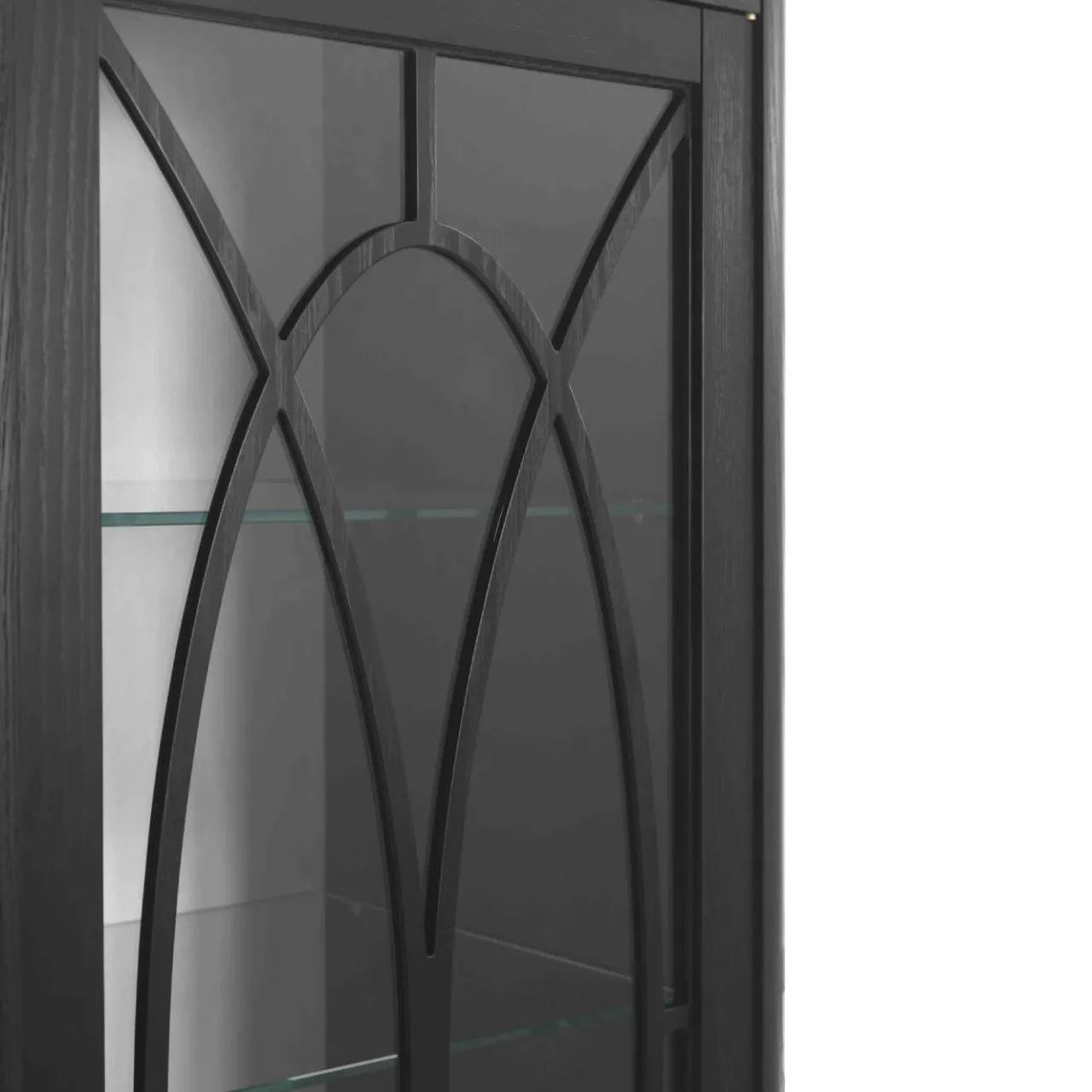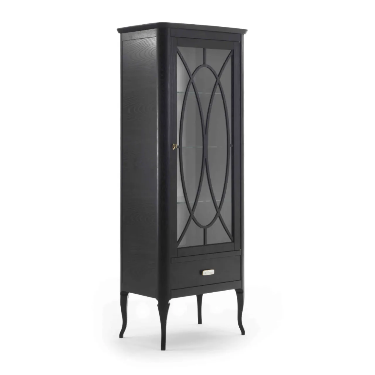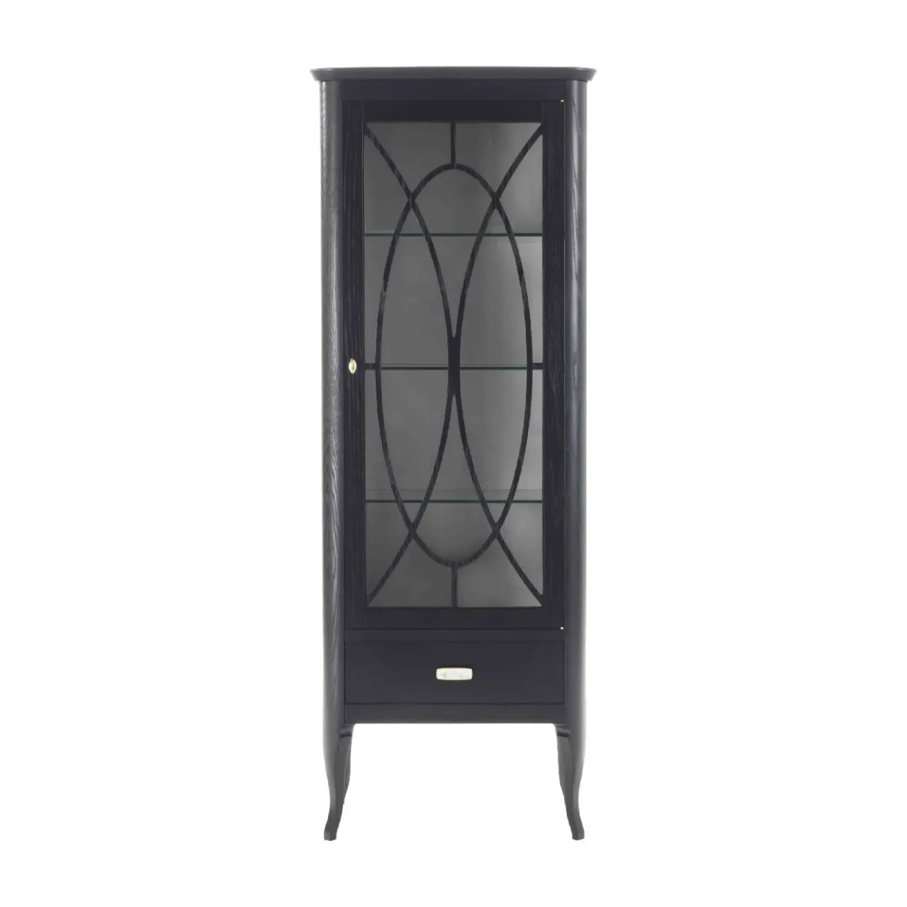 Semplice e sofisticata, questa vetrinetta diventerà il punto focale di un soggiorno o di una sala da pranzo in un ambiente moderno. Elegante e funzionale al tempo stesso, la struttura in legno di frassino con finitura ebanizzata si erge su sottili gambe in stile cabriole e presenta un’unica anta in vetro con un elegante pomello in ottone e un cassetto inferiore con maniglia in ottone Art Déco con inserto in corno di bufalo. All’interno del mobile, tre ripiani in vetro e un pannello posteriore in pelle sintetica avorio consentono di esporre con stile oggetti da collezione e preziosi.
